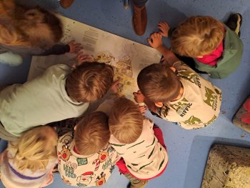 In der Bücherschatzkiste wartete Mio, der ihnen diesmal das Buch „Warten auf Goliath“ von Antje Damm mitgebracht hatte. Bär wartete ein ganzes Jahr geduldig auf seinen besten Freund Goliath. Die „Igel“ waren von der Geschichte begeistert. Sie suchten auch noch viele Bilderbücher aus dem Bilderbuchtrog zum Anschauen. Das übergroße Buch über Tiere auf der ganzen Welt hat ihnen besonders gut gefallen.