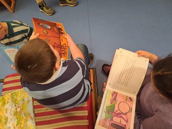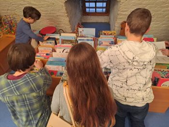 Schließlich fanden sie interessante Bücher im Bilderbuchtrog, die sie mitnahmen, um sie in der Schule zu lesen.
