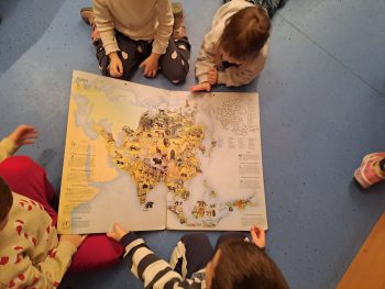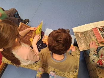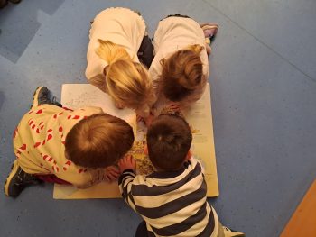 Die Kinder der Igelgruppe kamen zum ersten Mal im neuen Jahr zum Büchertausch. Sie wunderten sich sehr, dass diesmal die Leseschatzkiste leer war. Mio begrüßte sie und fragte, was wohl der Grund sein könnte, dass er sich nicht mit dem Buch in der Leseschatzkiste versteckt hat. Richtig: das Buch ist zu groß!