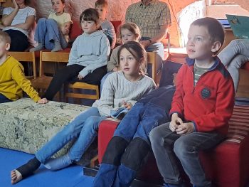 Aufmerksam lauschten die 18 Kinder Sonjas Frühlingsgeschichten und bewunderten die Bilder. Am begehrtesten waren wieder die Plätze am Juche mit bester Aussicht auf die Leinwand.